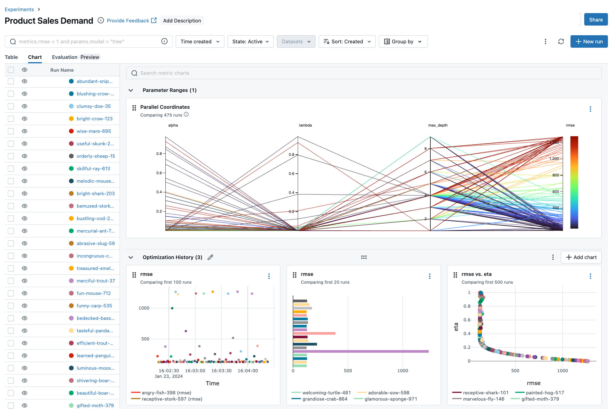 rf.fit(X_train, y_train)Once the above code finishes, run the following command in a separate terminal and access the MLflow UI via the printed URL. An MLflow Run should be automatically created, which tracks the training dataset, hyper parameters, performance metrics, the trained model, dependencies, and even more.