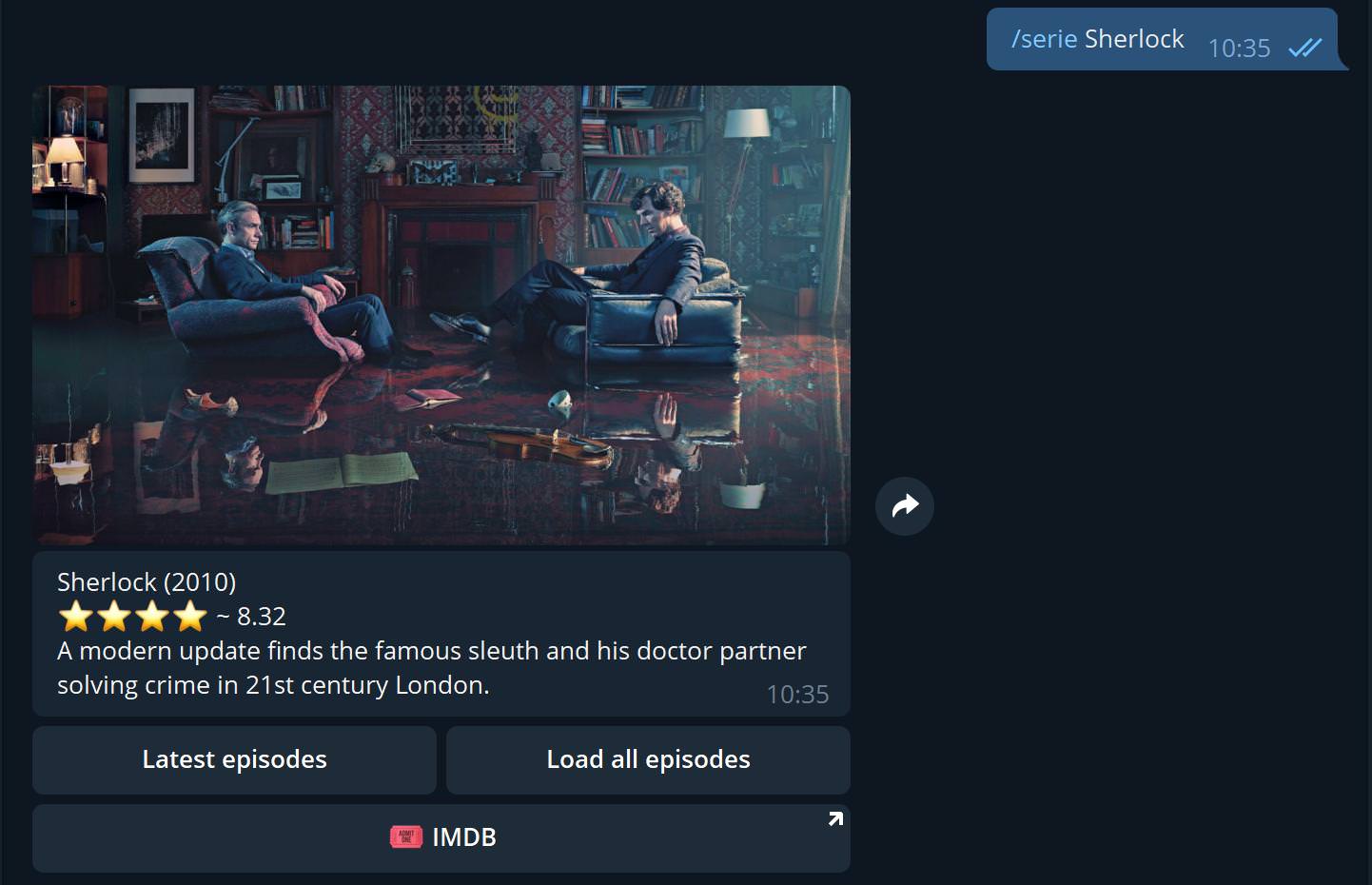 Outputs rating, description and imdb, yt and .torrent links to the requested movie.