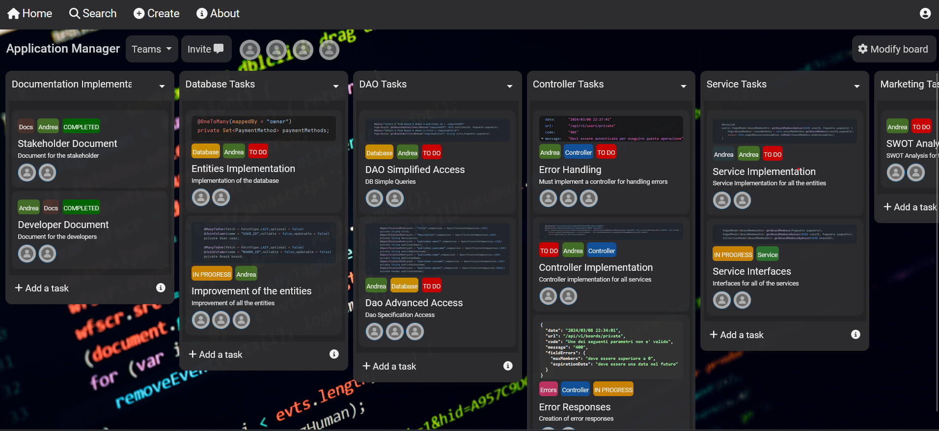 Implementazione di una RESTFul API utilizzando Java e Spring Boot che permette agli utilizzatori di ottenere e modificare dati riguardanti delle bacheche che permettono agli utenti di gestire un progetto più complesso. L'applicazione mette a disposizione degli end-point per manipolare le risorse contenute all'interno del database, questi sono successivamente utilizzati dal client front-end implementato in Angular per semplificare l'utilizzo agli utenti finali. E' stato utilizzato il pattern MVC per la gestione delle richieste ricevute dagli utenti finali.