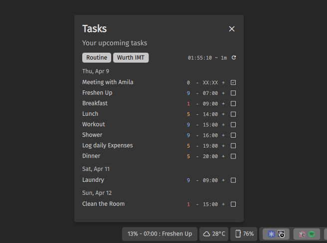 Display up to 5 timezones on the DankBar. Toggle between showing all at once or cycling one at a time at a configurable interval.