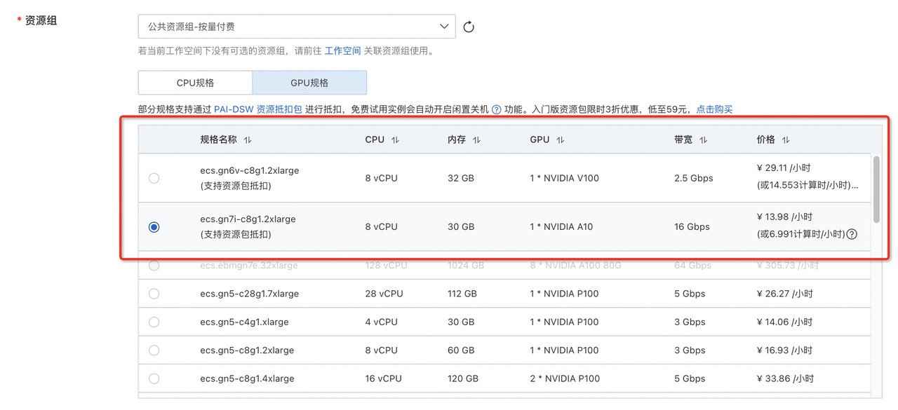 Create a DSW instance, select the resource group that can deduct resource package, and select the instance image pytorch:1.12-gpu-py39-cu113-ubuntu20.04
