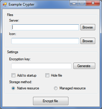 Example crypter is a project demonstrating how executable files can be encrypted and injected into memory (without the payload being dropped on the disk) using a stub file.