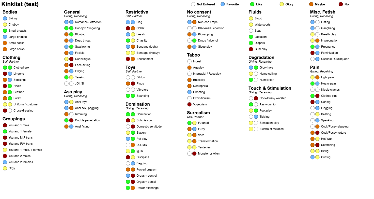 Original Kinklist project was made by Goctionni. This is a complete rewrite of his project, made from the ground up. All of the code was rewritten. Unfortunately, this also means that not all browsers may be supported. If the page doesn't render properly on your device, please visit original project page, update your browser, file an Issue or create a new Pull request.