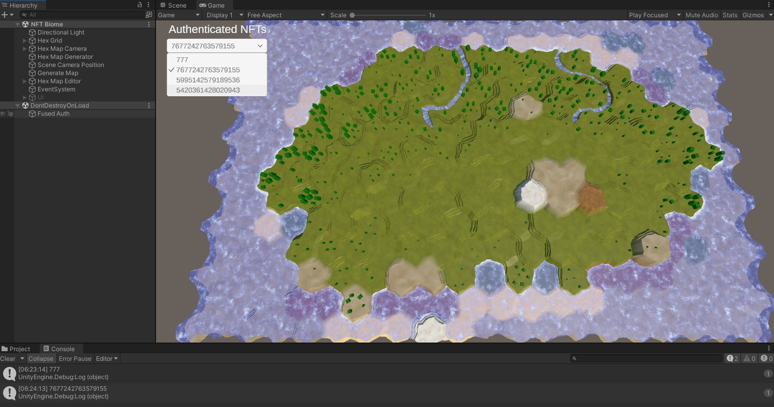 The Unity Project is located on the master branch and the main map generation is based on the project from Catlike Coding. The project utilizes the FusedVR Chain Auth solution in order to authenticate a player's wallet and confirm ownership of their assets. By logging into the service with their e-mail address, users are able to sign a confirmation message from the wallet of their choice, whether it is desktop or mobile. Then using the SDK, the game can see the list of NFTs owned by the player.