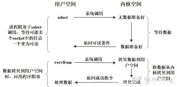 2)IO多路复用(I/O multiplexing):可以一口气监听多个文件描述符的准备情况,这里又分使用的是select还是epoll。但无论选哪一个,能拿到的只是文件描述符的可读状态,用户进程拿到了可读的文件描述符,仍需要一次系统调用将数据拷贝到用户空间,而这一步是阻塞的。