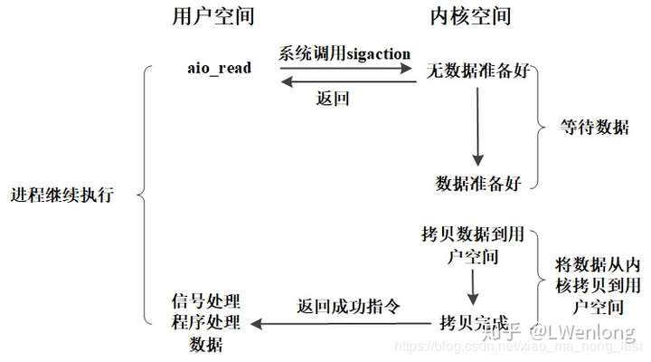 4)异步IO(asyncrhonized I/O):也是先注册信号处理程序,但是这次会由内核直接完成从内核空间到用户空间的拷贝,减少了一次系统调用。用户的信号处理程序可以直接拿到可直接使用的数据。