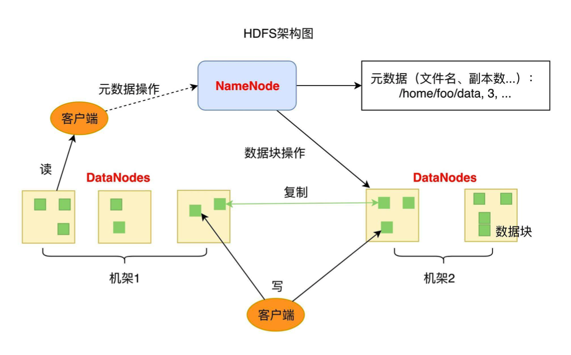 在Hadoop分布式文件系统中,这个服务化的inode称为NameNode,服务化的data block存储角色称为DataNode。对数据的读写需要借助Hadoop Client和HDFS(Hadoop Distributed File System)交互