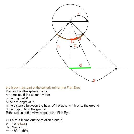 设整个球面镜(鱼眼)的张角的一半为A(弧度),则r = ri(图片的半径,也就是整个鱼眼弧长的一半) / A 为了让原图的所有像素都纳入鱼眼内,势必有tan(A) = R(视野半径,即为ri) / h => h = ri / tan(A)