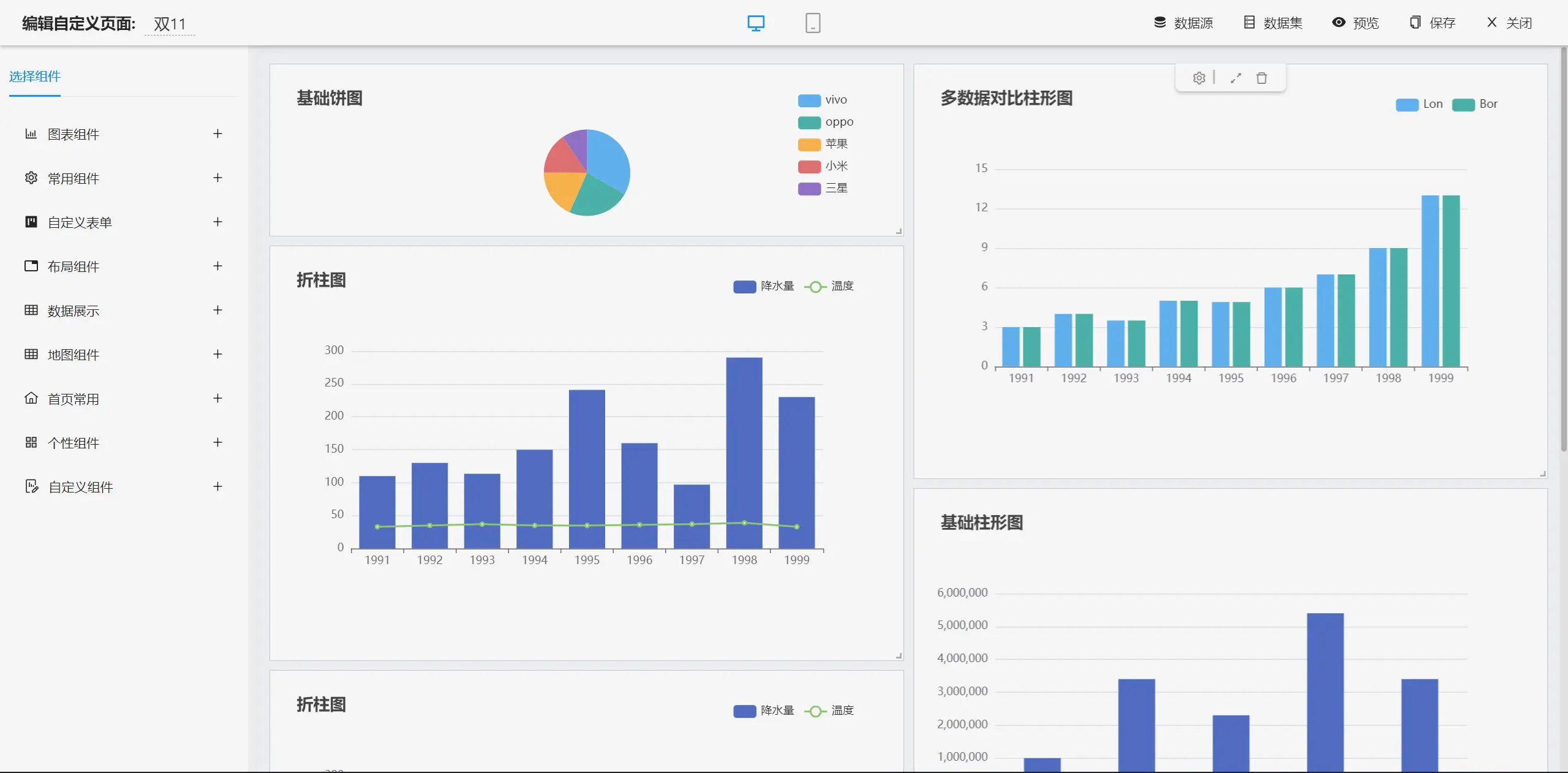- 大屏设计器支持几十种图表样式,可自由拼接、组合,设计炫酷大屏