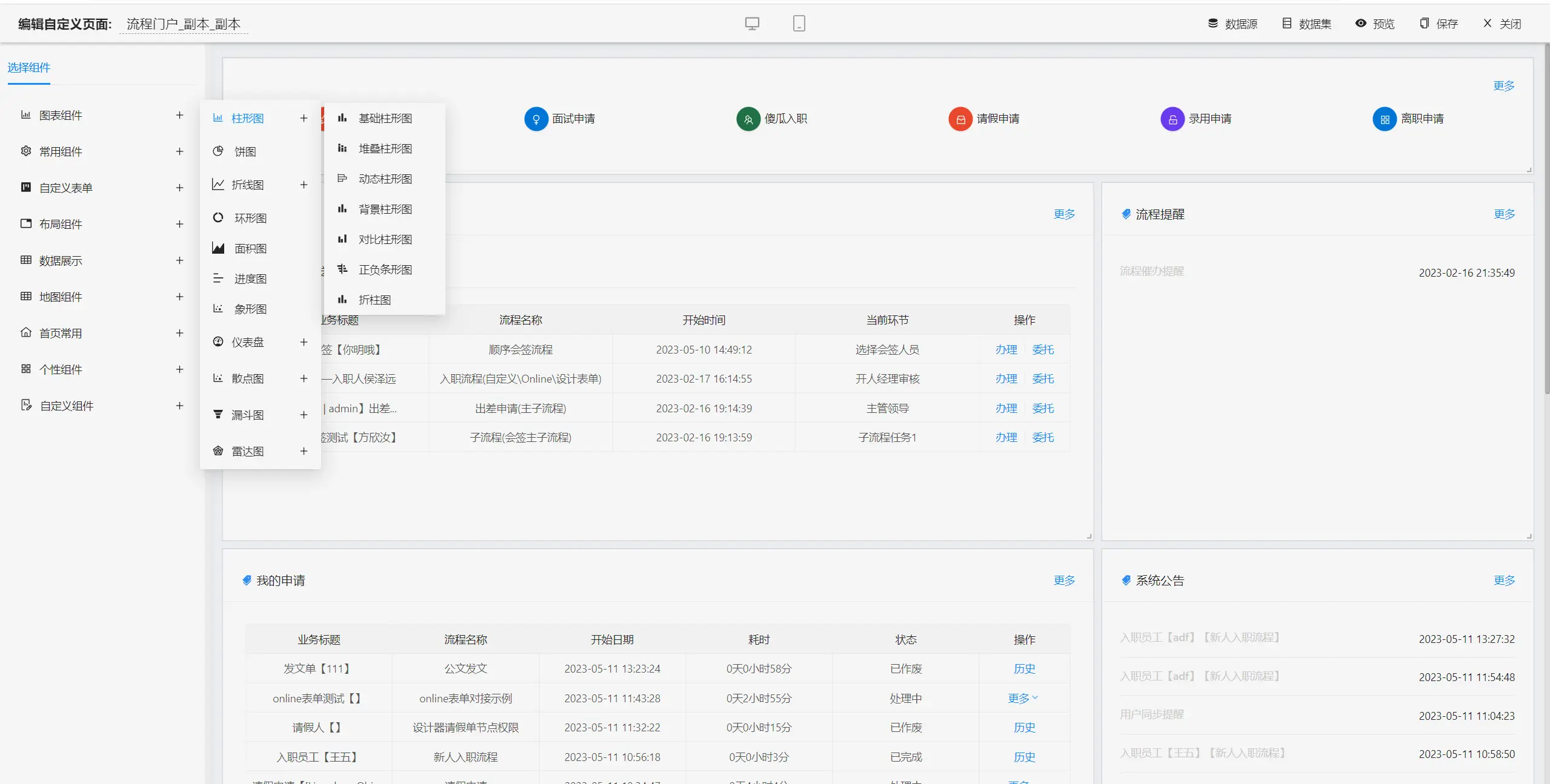 - 支持 ECharts,目前支持28种图表,在线拖拽设计,支持SQL和API两种数据源