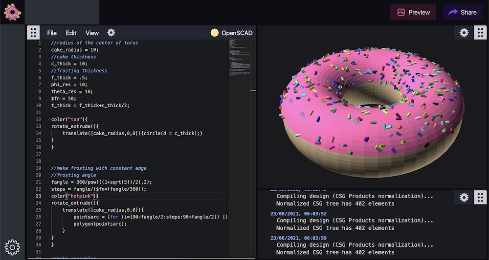 JSCAD (formally know as OpenJSCAD) provides a programmer’s approach to develop 3D models. In particular, this functionality is tuned towards creating precise models for 3D printing.