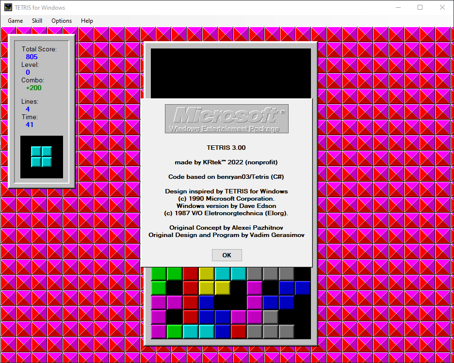 I restyled the benryan03/Tetris source code to look like the TETRIS for Windows from Microsoft Entertainment Pack known from Windows 3.11/95.