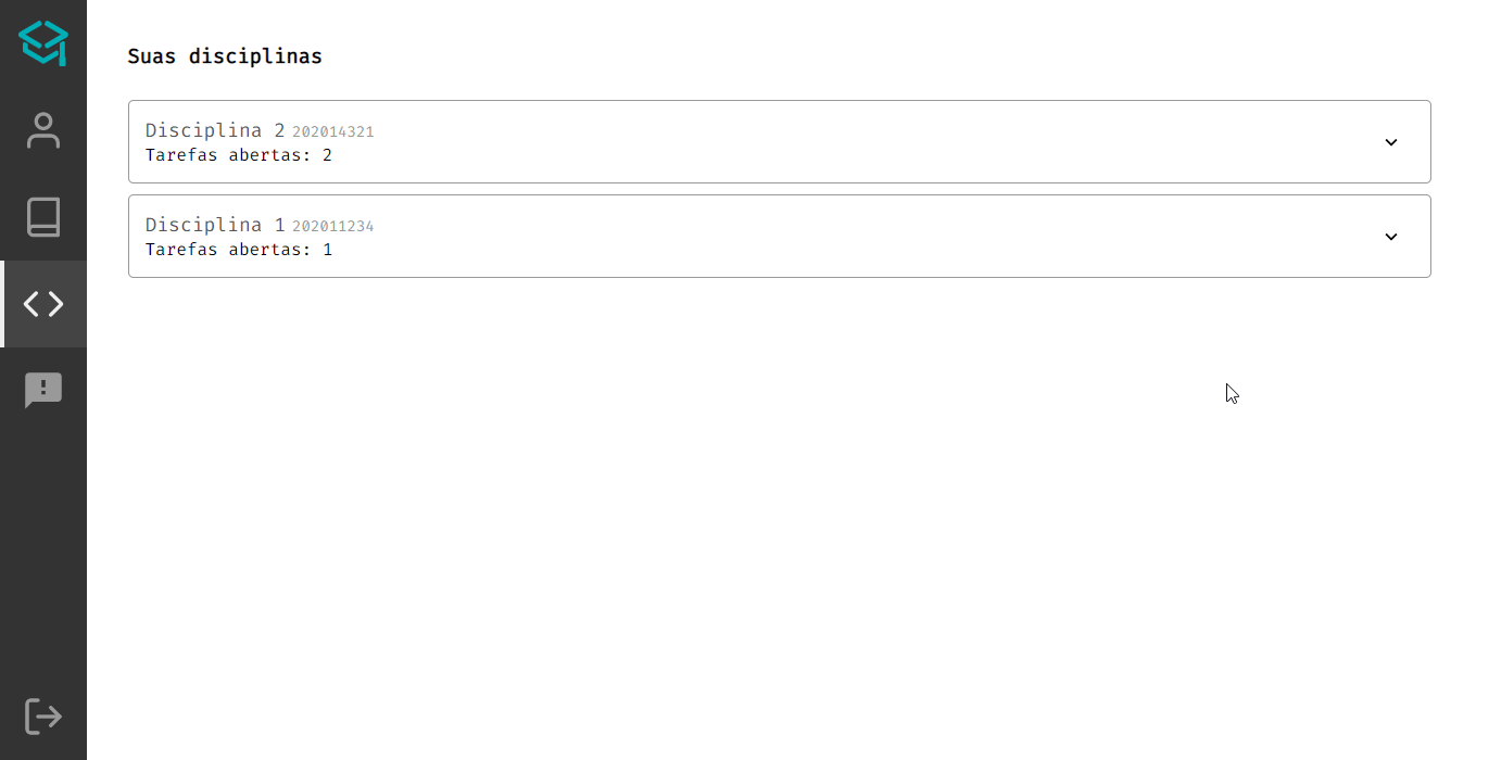 Esta página exibe as tarefas, que são separadas por disciplinas, o professor pode gerenciar essas tarefas e também criar novas tarefas.