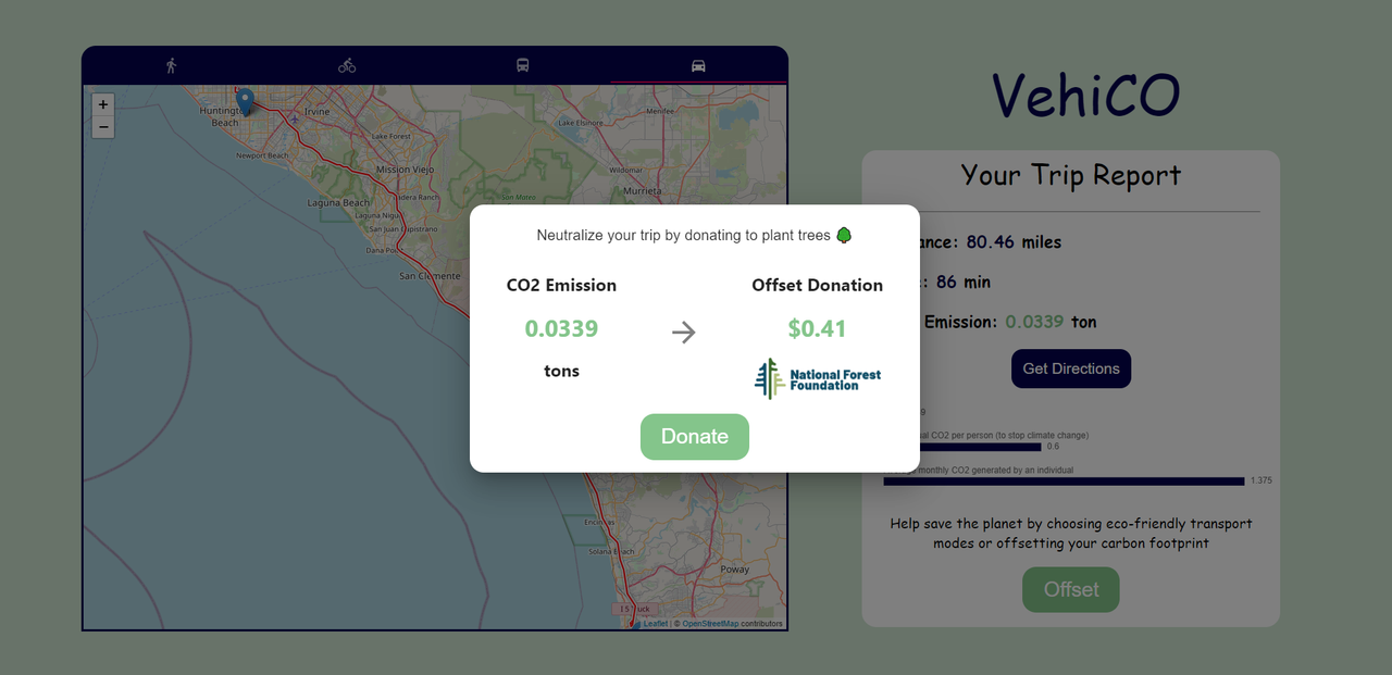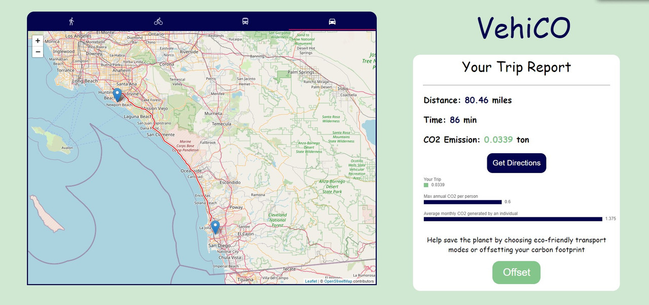 VehiCO (pronounced Vehicle) is a webapp that aims to help users be more environmentally-conscious and make informed decisions by comparing the CO2 emission of different transportation modes for their trip. We also encourage users to take actions and contribute to sustainability efforts by providing a convenient way for them to neutralize their emission by donating to plant trees.