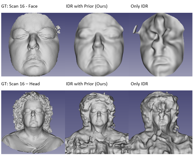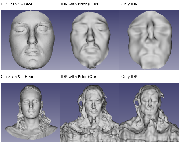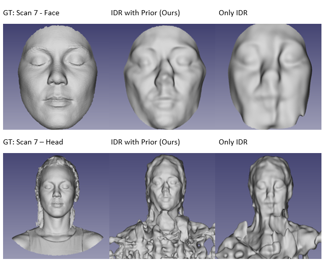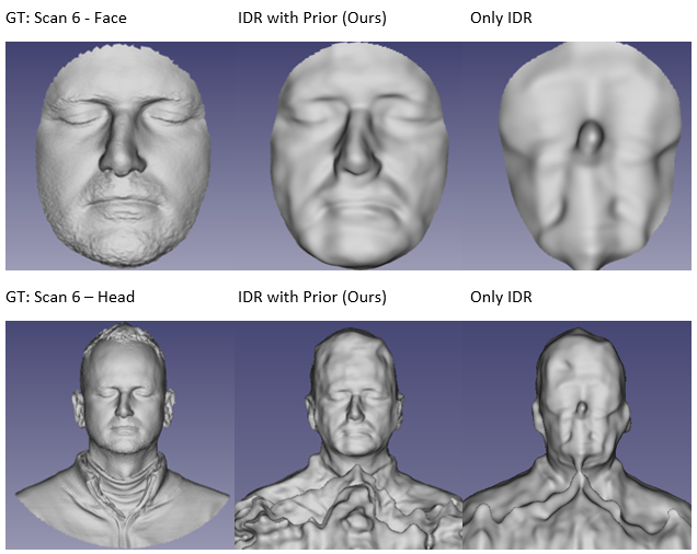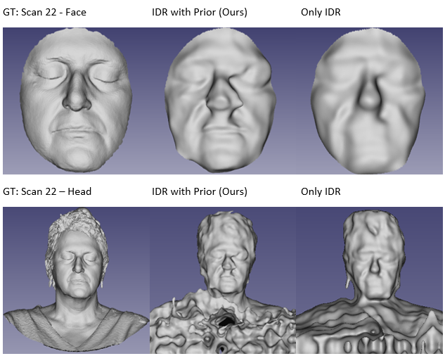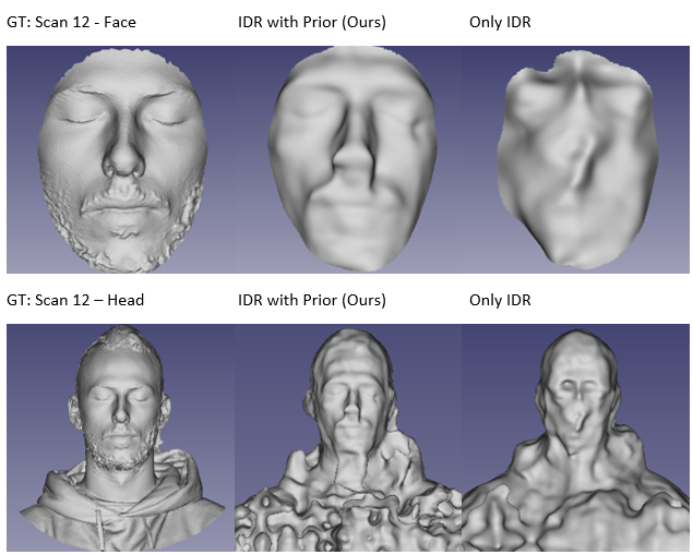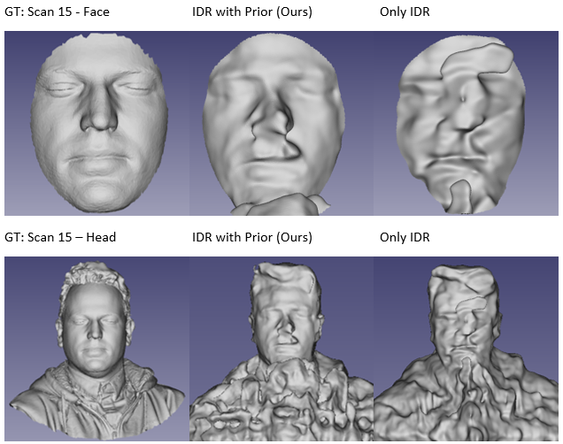 In this section, we disuss the results of training IDR on the H3DS dataset for 10 different scans using our simple prior of scan 2 trained for 500 epochs and only using 3 views. In the paper of H3D-Net, only the average of the 10 different scans was shown, therefore we also show only the average result on all 10 scans. Table 2 below shows these results. To see the results per scan, please look at the images provided in the Appendix. Training the prior on 32 images took approximately 4 hours and to train one scan for 2000 epochs with the prior, it took approximately 2 hours per scan. After the initial experiments were completed we trained for almost 20 hours for all 10 scans. All together we believe we trained for about 30 hours.