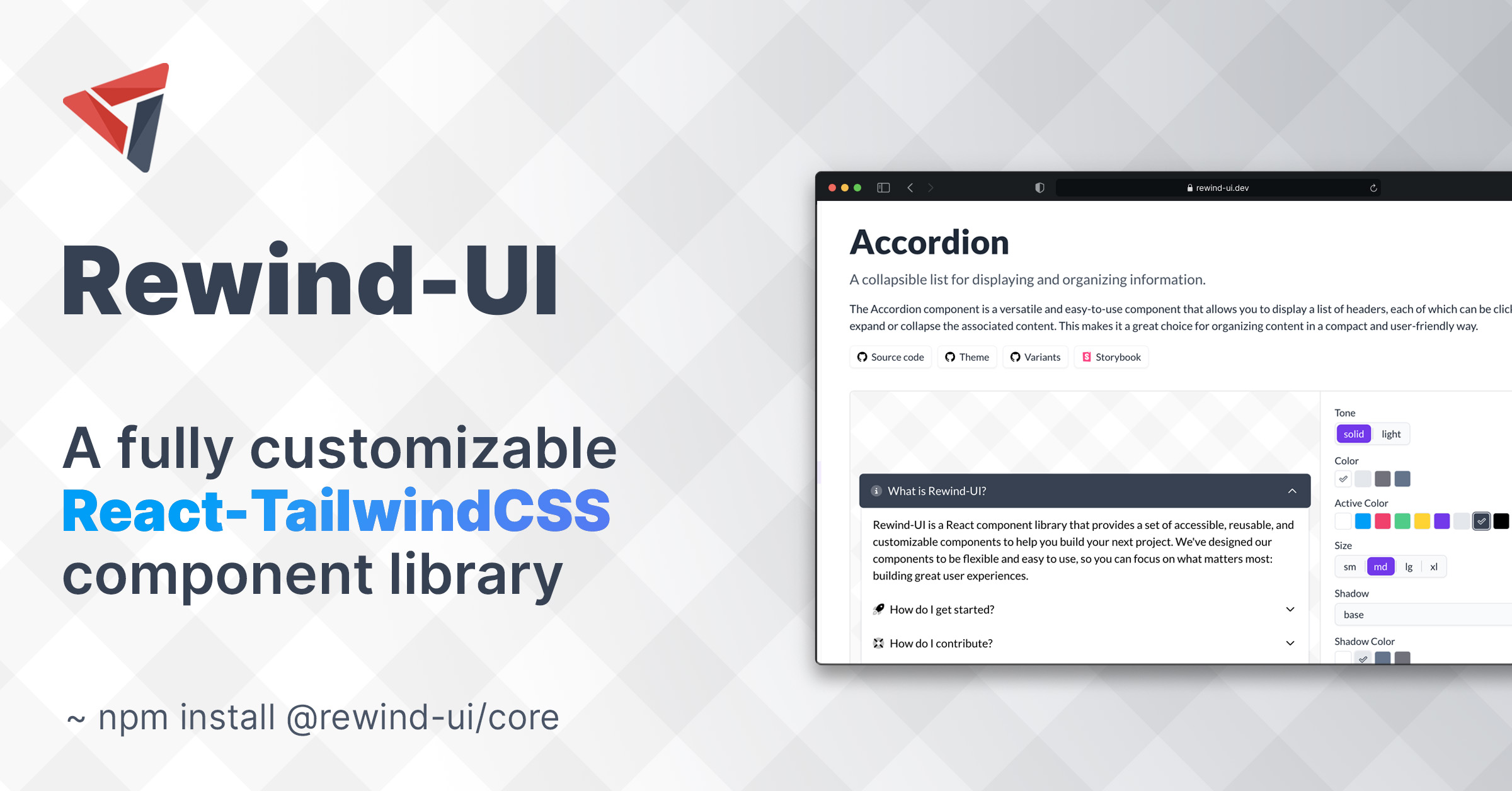 Built specifically for use with React and Tailwind CSS, Rewind-UI offers a range of accessible, highly customizable components that can be easily integrated into any react project. Rewind-UI comes with a set of default styles that can be easily customized using Tailwind CSS classes. Furthermore, each component can be parameterized using a set of props that can be used to change the default styles of the component.