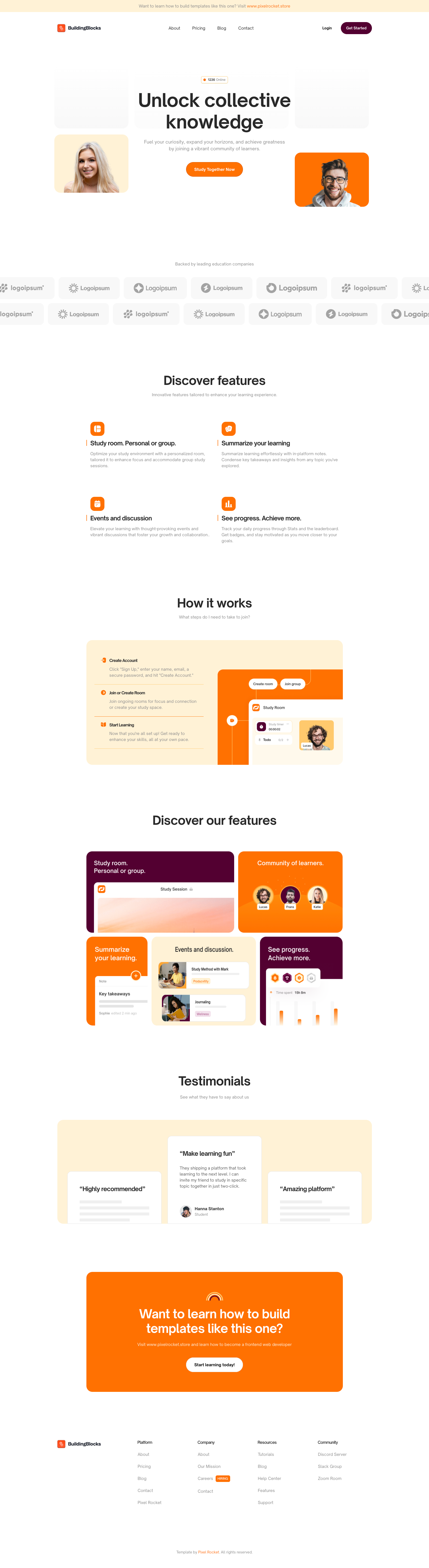 The Building Blocks Template is a versatile HTML template designed to foster collective learning and collaboration. This template is ideal for educational platforms, study groups, and any community focused on sharing knowledge. It features a modern and clean design, with essential pages such as the Homepage, About Us, Pricing Page, Blog Listing Page, Contact Us, Login, and Register pages.