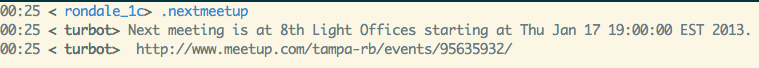 The Meetup plugin gives some basic information about the next Tampa Bay Ruby Brigade meeting.