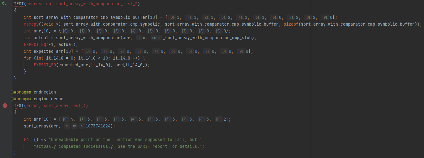 UnitTestBot C/C++ displays the test run results near the test headers. The green signs mark the passing tests, while the red ones mark the failing tests.