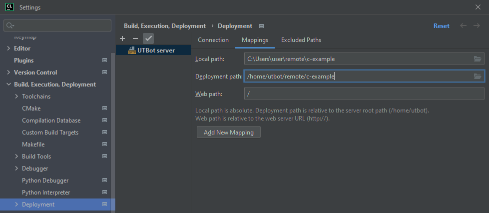 If the UnitTestBot C/C++ server and the CLion plugin are installed on different machines, or the server is installed via Docker, you have to use the Deployment feature.