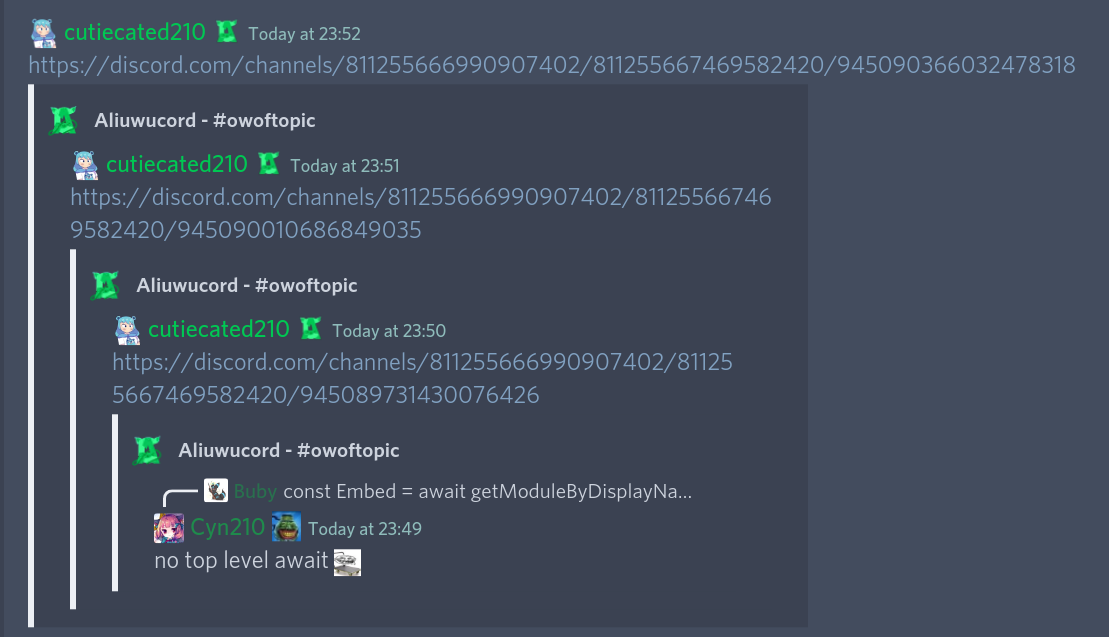 Plugin that embeds message links. Unlike other similar plugins, this plugin embeds the actual message components, which means embedded messages look just like the originals. Also allows nested embeds lmao