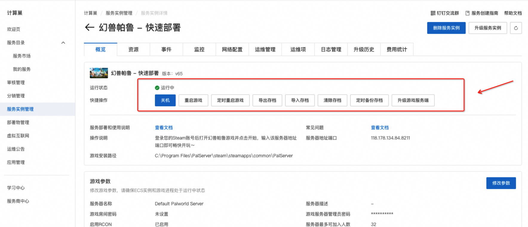 后续在创建幻兽帕鲁服务实例的时候,游戏玩家就可以直接对服务进行运维操作了,以下是操作界面示例。