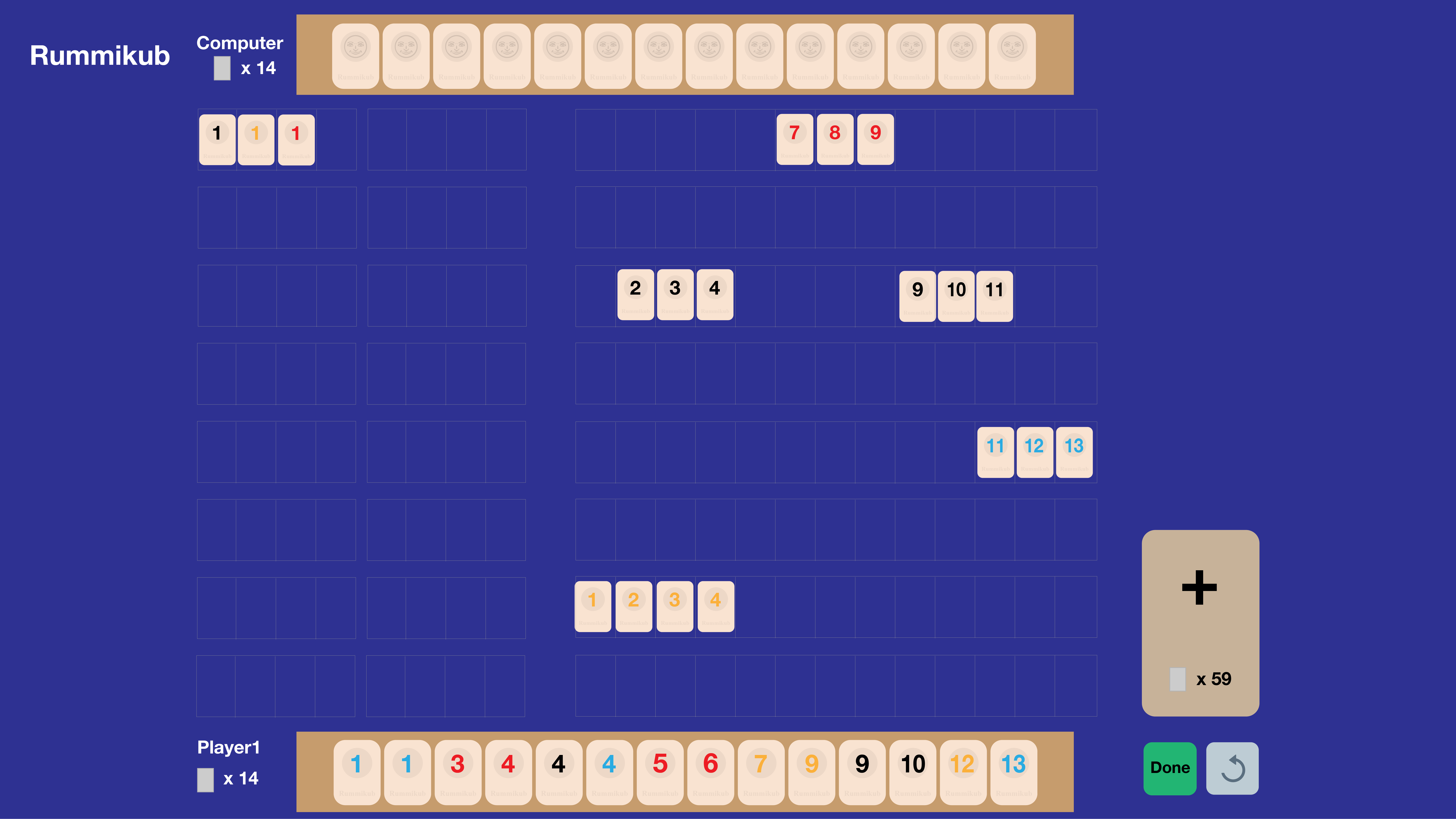 A MVP of Rummikub should deal tile automatically, allow user to draw randomly from the pouch by clicking the "+" button, allow user to rearrange tile with both tile on hand and tile in the playground and at the end validate the result. The winner will be the one who empty the rack first and the score will be calculated by the points remain on the losers rack.