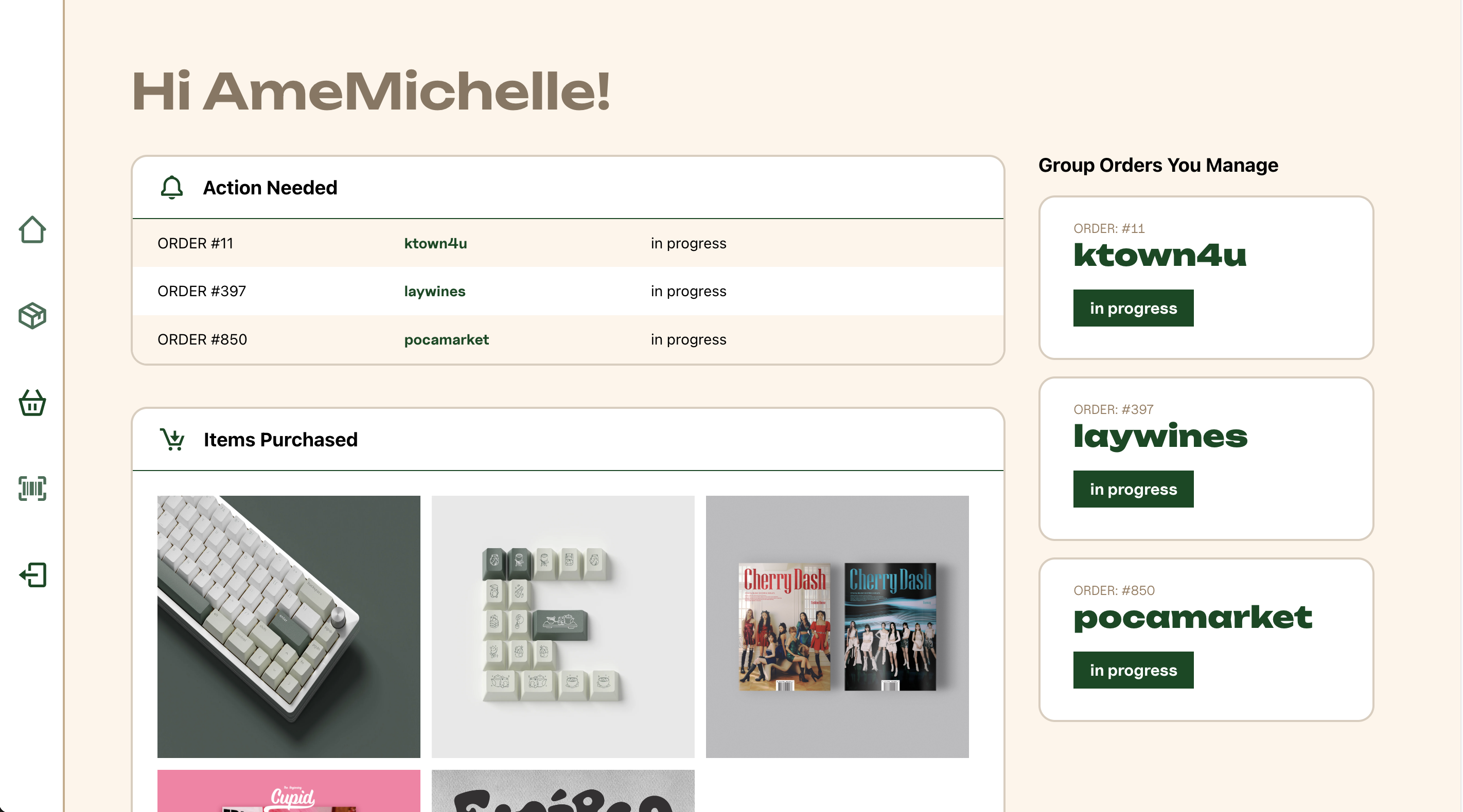 - Manage your group orders + items purchased across different group orders on the home dashboard.
