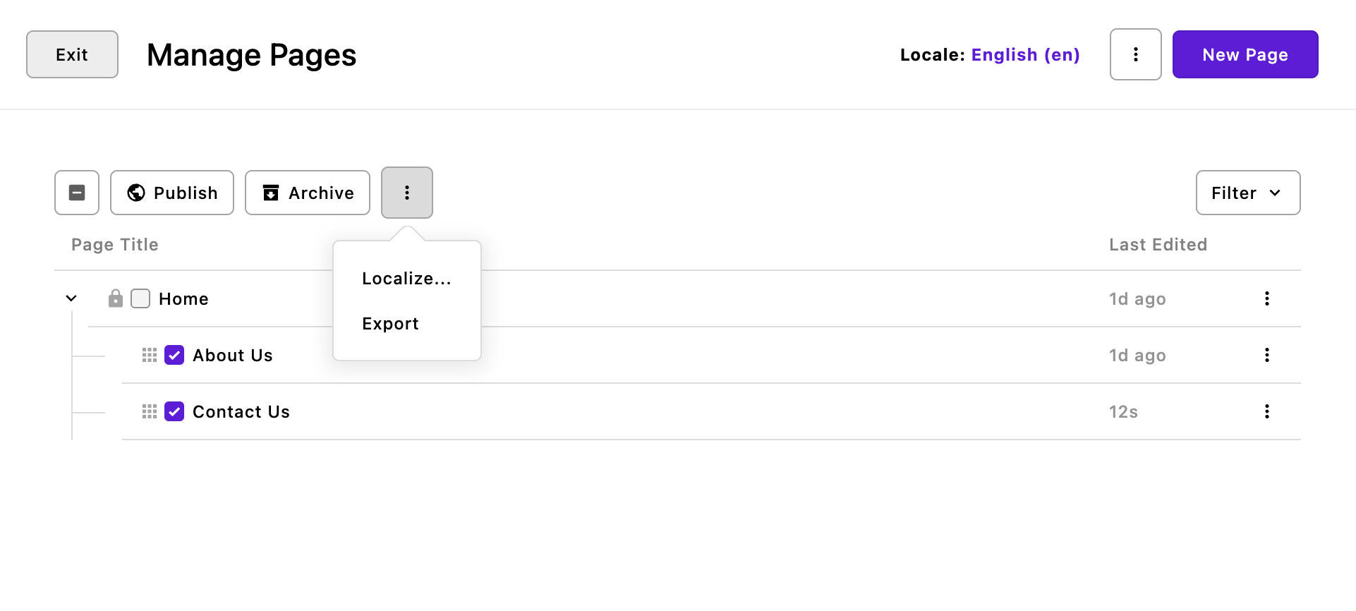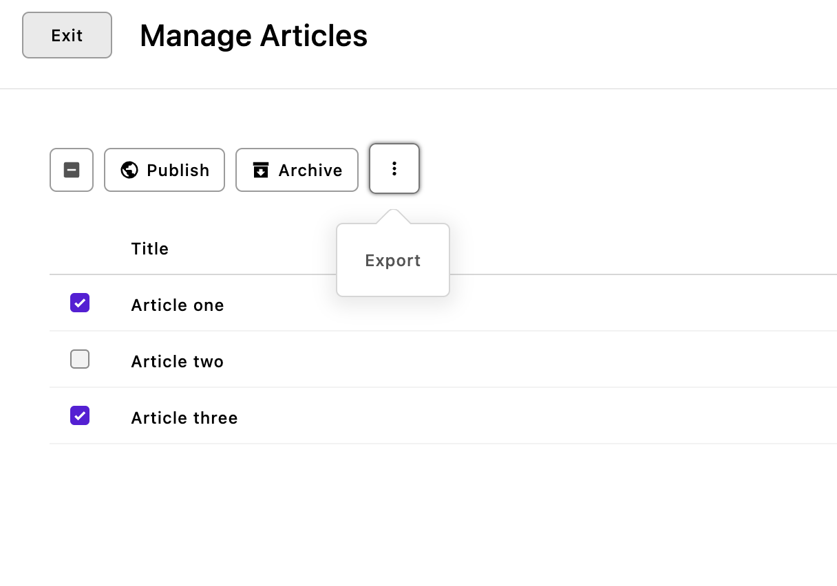 Unlike pages, pieces can be exported either individually from the context menu to the right of the piece, or as a batch using the context menu above the pieces list in the manager. For example, in the image above two articles have been selected for export. As with the page-type, all exporting is per-locale.