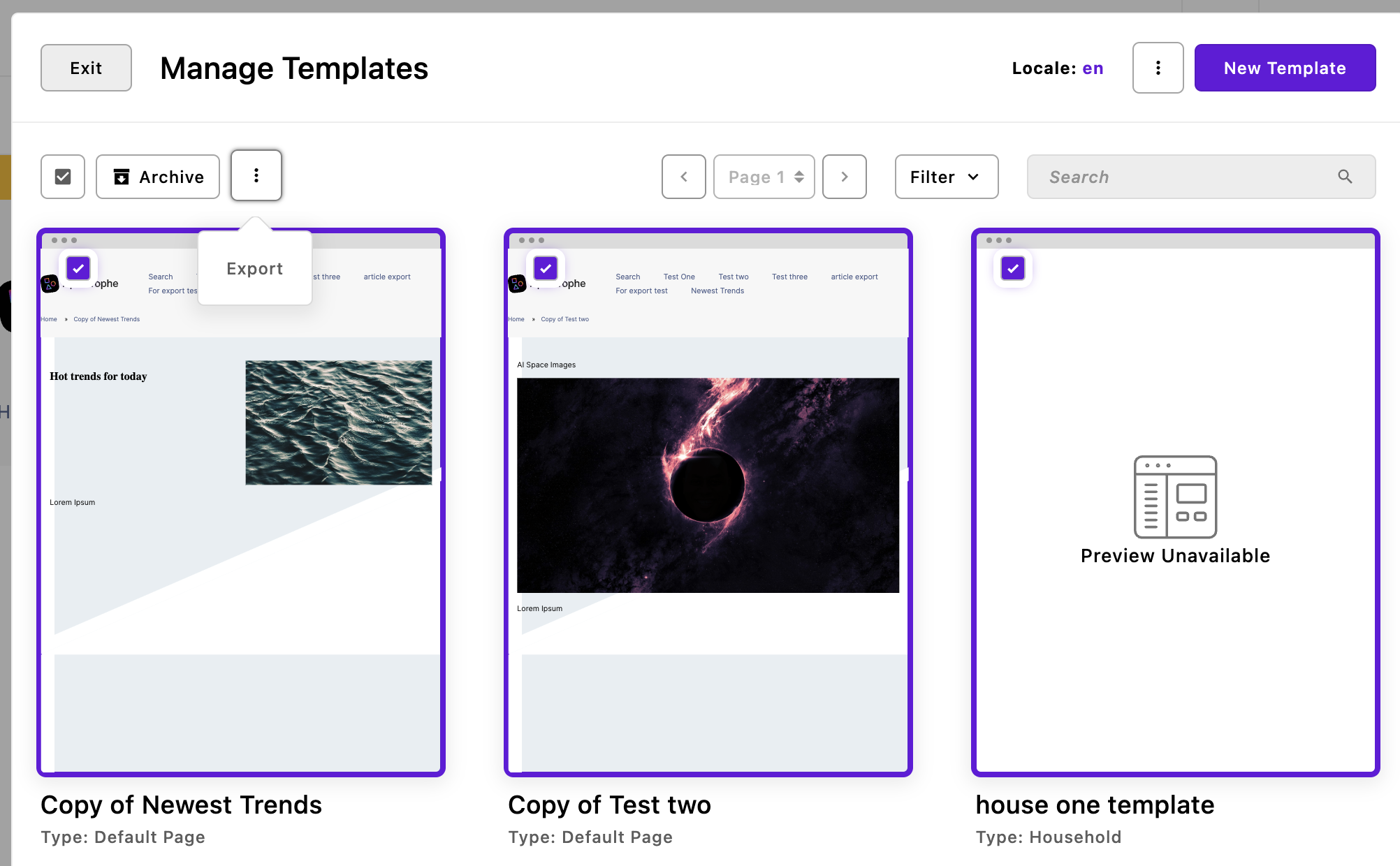 If you have the Template Library Pro module installed, templates are exported by selecting one or more within the template manager and then using the context menu located to the right of the batch operations. Like with the piece-type exporter you can elect to batch export just one or multiple documents depending on how many are checked. As with the page-type, all exporting is per-locale.
