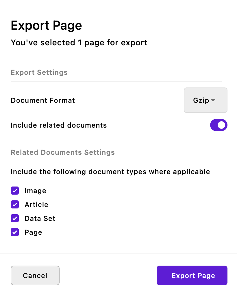 The second input toggles whether documents associated with the page, like images, files, pieces, or pieces related via relationship fields in the document or its widgets, should be included in the download. Any or all can be unselected. Note that this doesn't mean that the particular page includes all of those document types, just that those document types both exist in your project and aren't disabled for export.