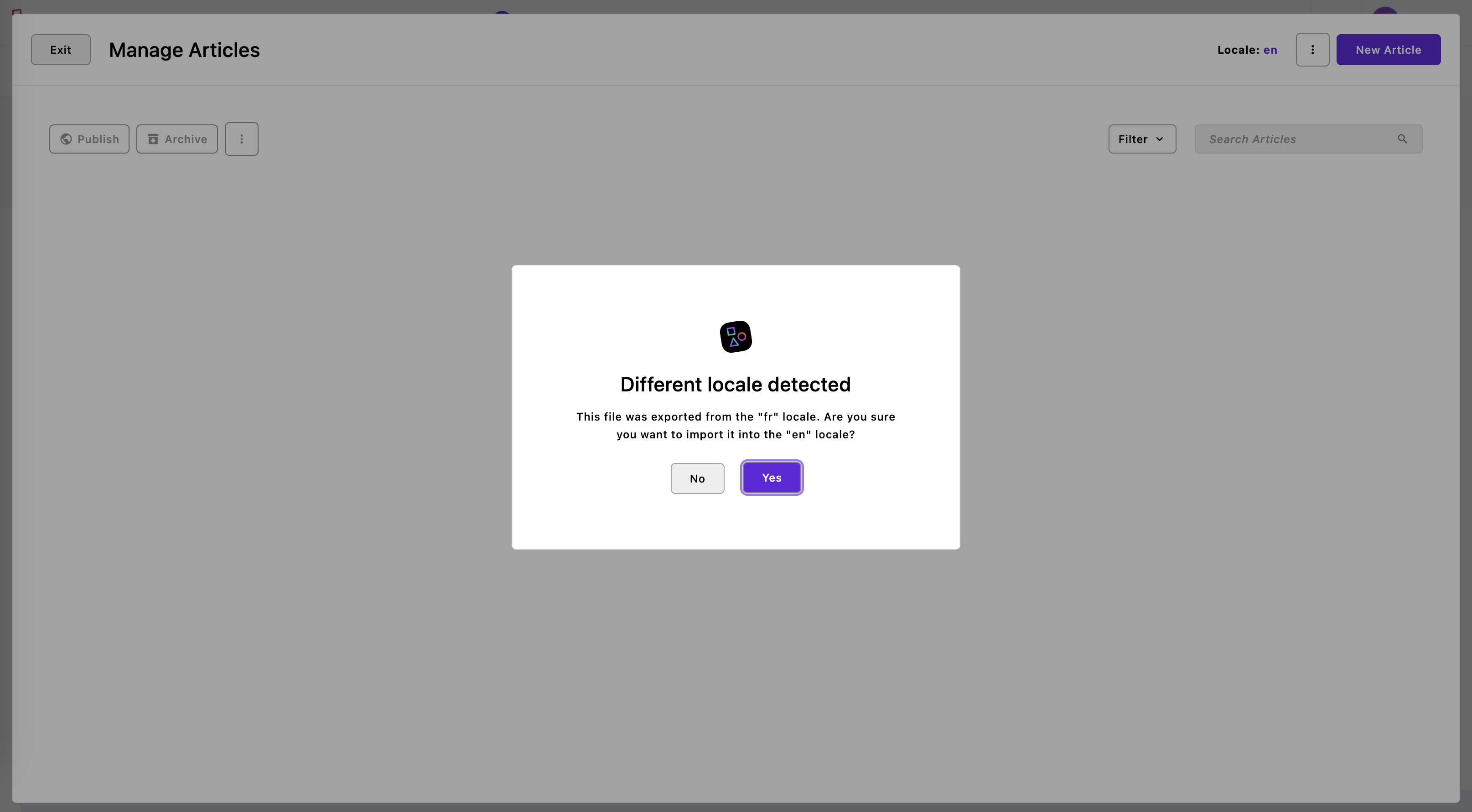 When importing a page, piece(s), or template(s) that was exported from one locale while currently in another locale, and you do not have the automatic translation module or have not elected to translate content, you will get a notification asking if you want to proceed.