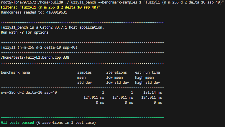 This will output a list of benchmark names. One example of a benchmark name is fuzzyl1 (n=m=256 d=2 delta=10 ssp=40). We can run this specific benchmark running the following command: