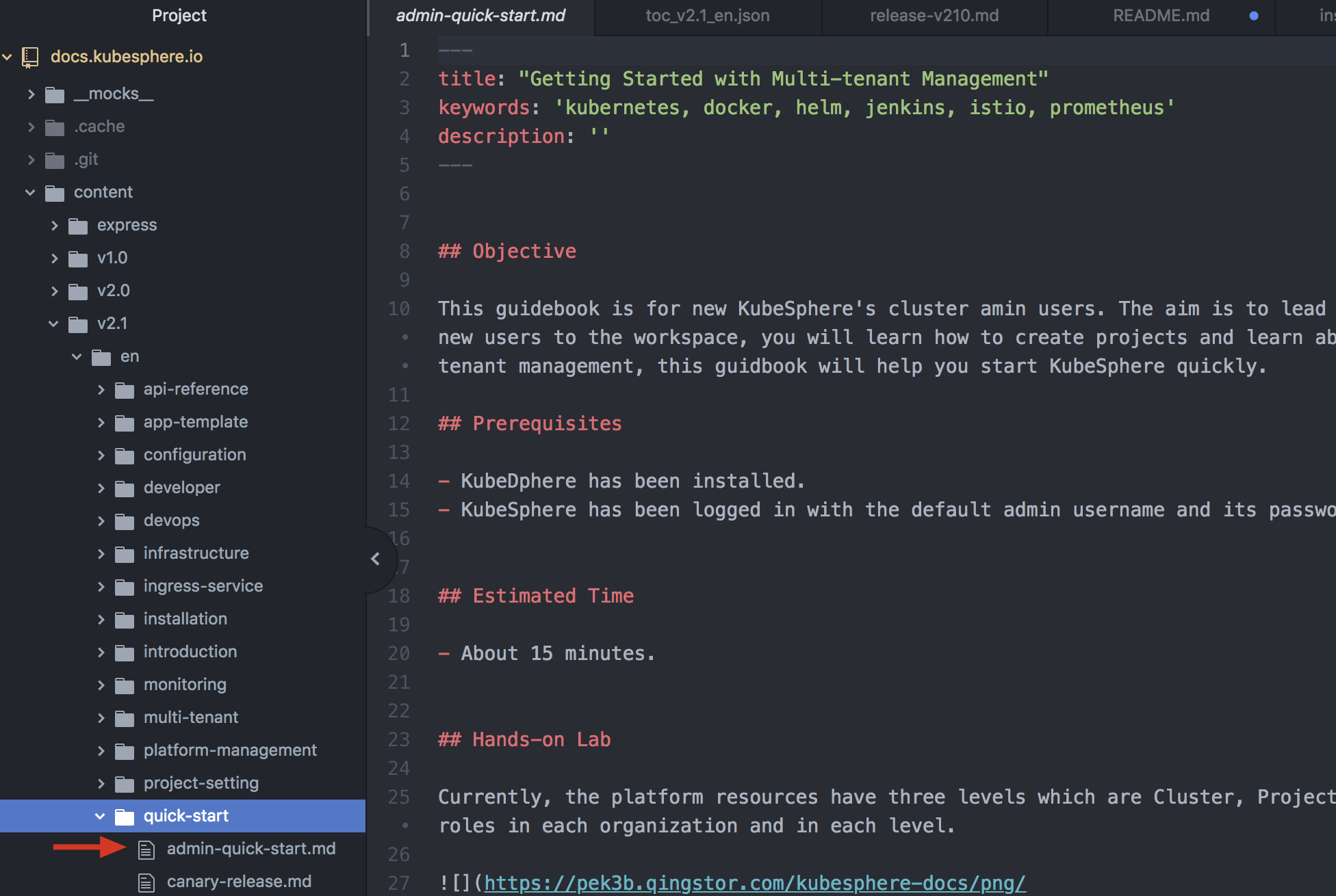 Expand the path /v2.1/en/quick-start/admin-quick-start/, then edit the admin-quick-start.md, save it after modification, and then using git to commit your changes to remote.
