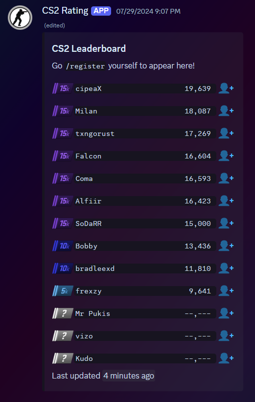 Discord Bot for displaying a self-updating Leaderboard for CS2 Premier Ratings in small Communities and managing rating-based Roles for Members.