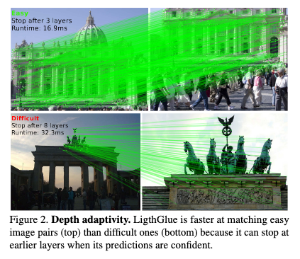easier to train. One key property is that LightGlue is adaptive to the difficulty of the problem: the inference is much