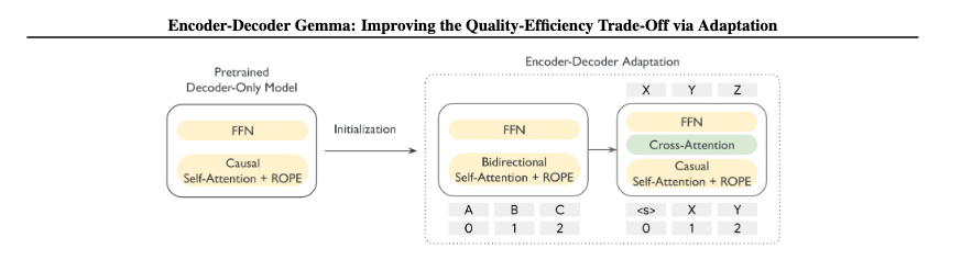 T5Gemma (aka encoder-decoder Gemma) was proposed in a research paper by Google. It is a family of encoder-decoder large langauge models, developed by adapting pretrained decoder-only models into encoder-decoder. T5Gemma includes pretrained and instruction-tuned variants. The architecture is based on transformer encoder-decoder design following T5, with improvements from Gemma 2: GQA, RoPE, GeGLU activation, RMSNorm, and interleaved local/global attention.