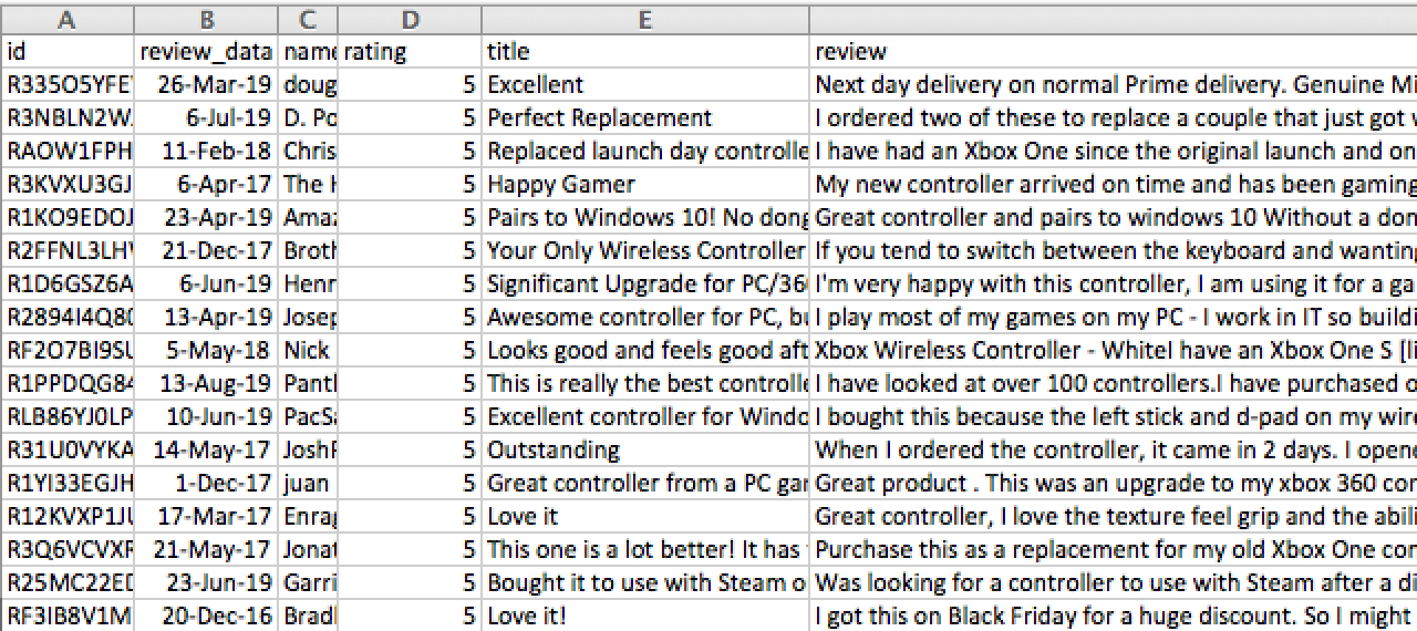 $ amazon-buddy products -k 'xbox one' -n 300 --min-rating 3 --max-rating 4Output: 1552945544582_products.csv