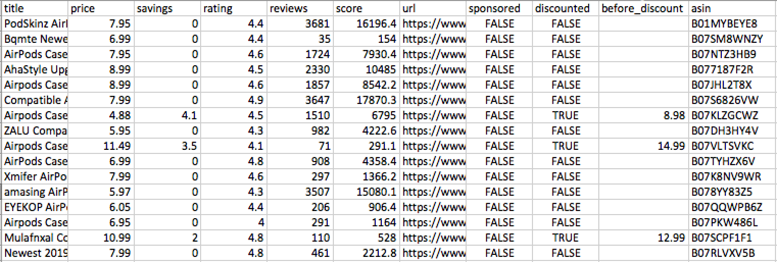 $ amazon-buddy products -k 'vacuum cleaner' -n 40 --filetype csvOutput: 1552945544582_products.csv
