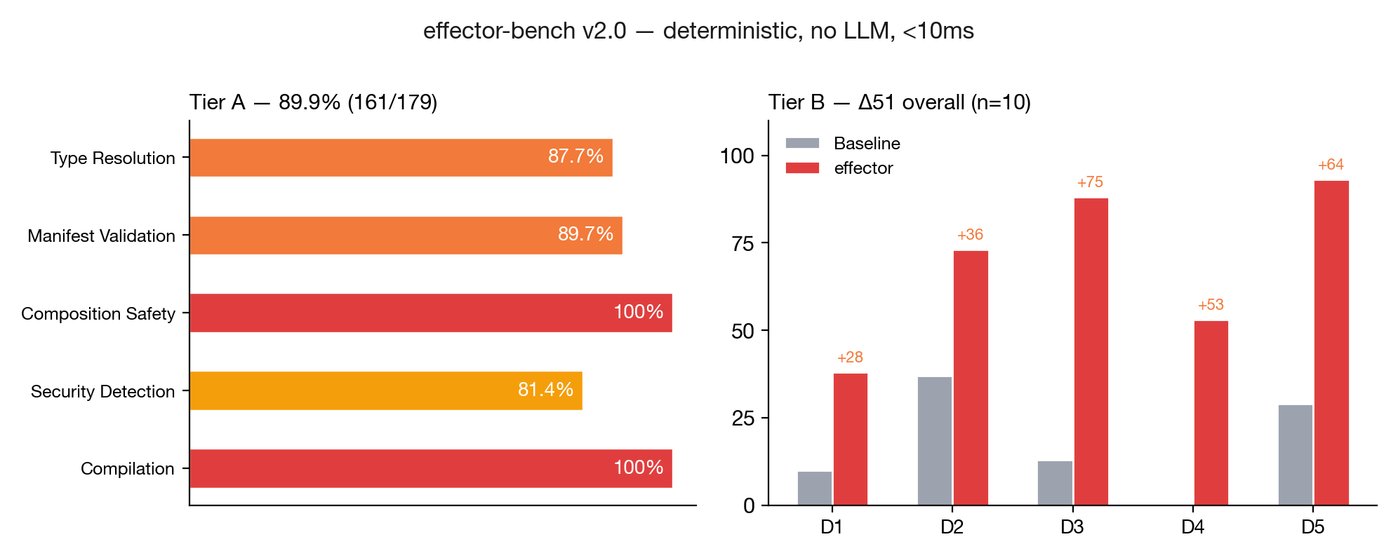 Tier A — 179 adversarial cases, 89.9% accuracy. 18 known gaps documented. Tier B — Controlled variable (n=10, grounded in BFCL, τ-bench, ToolSword, MCPToolBench++). Δ+51 overall (+43 comparable, +64 differential), 0 regressions. Methodology.