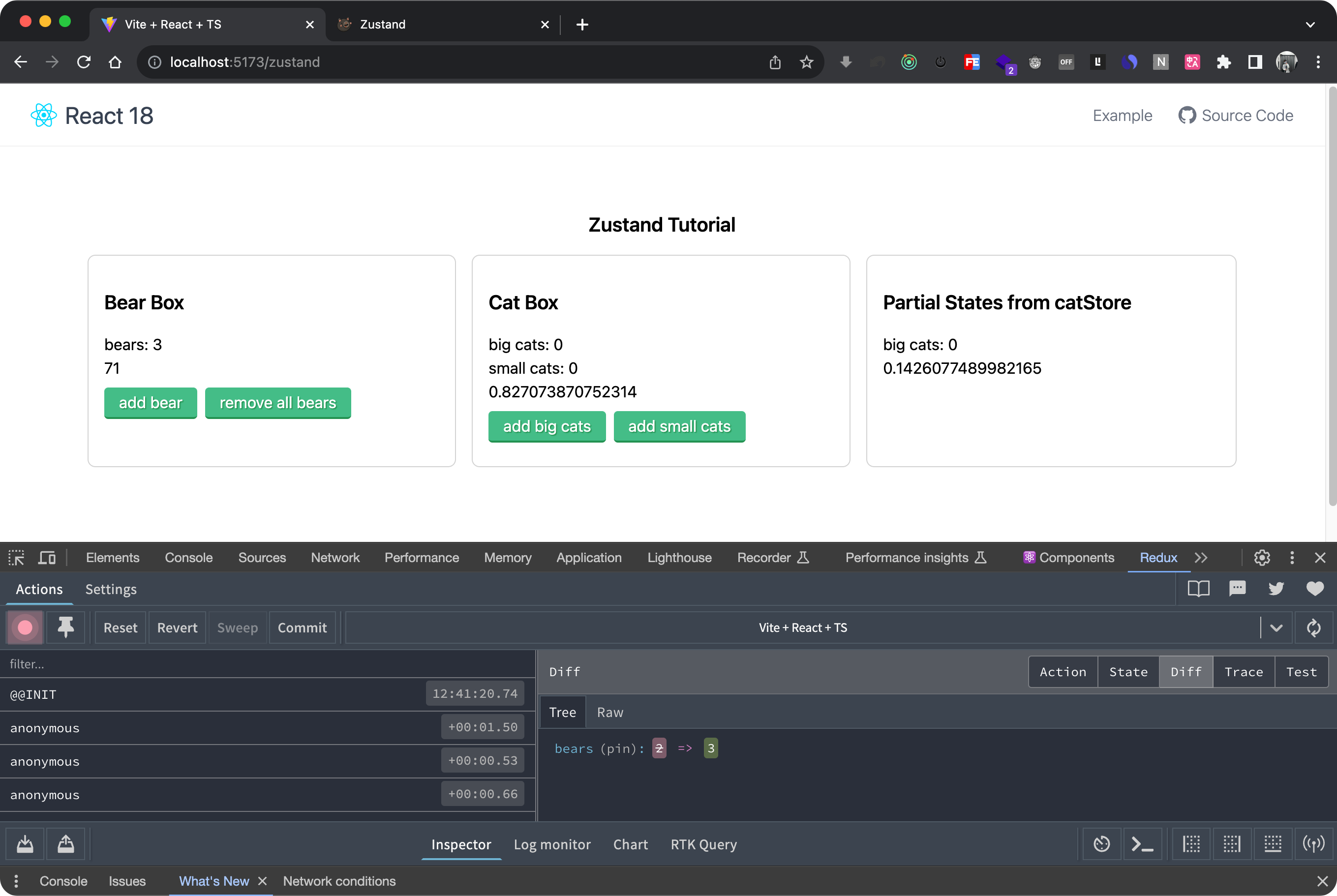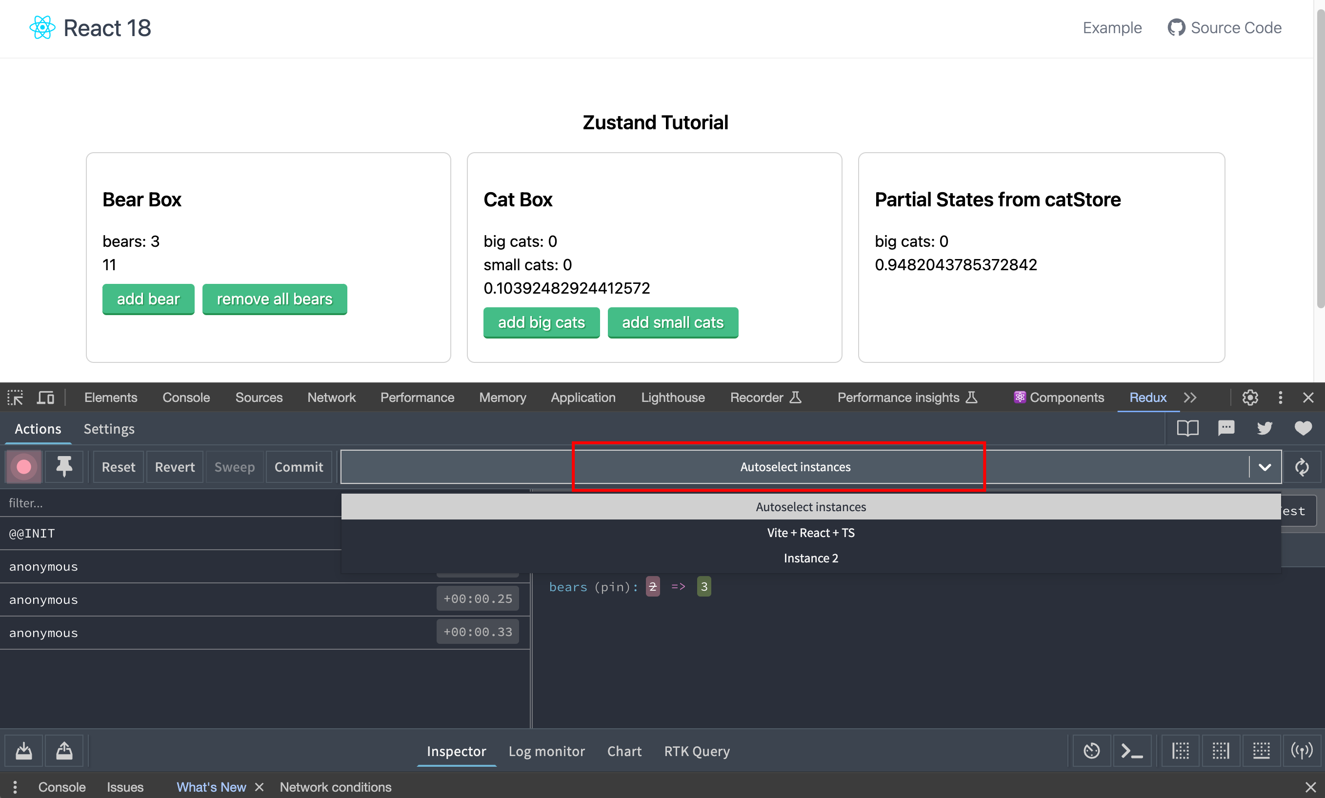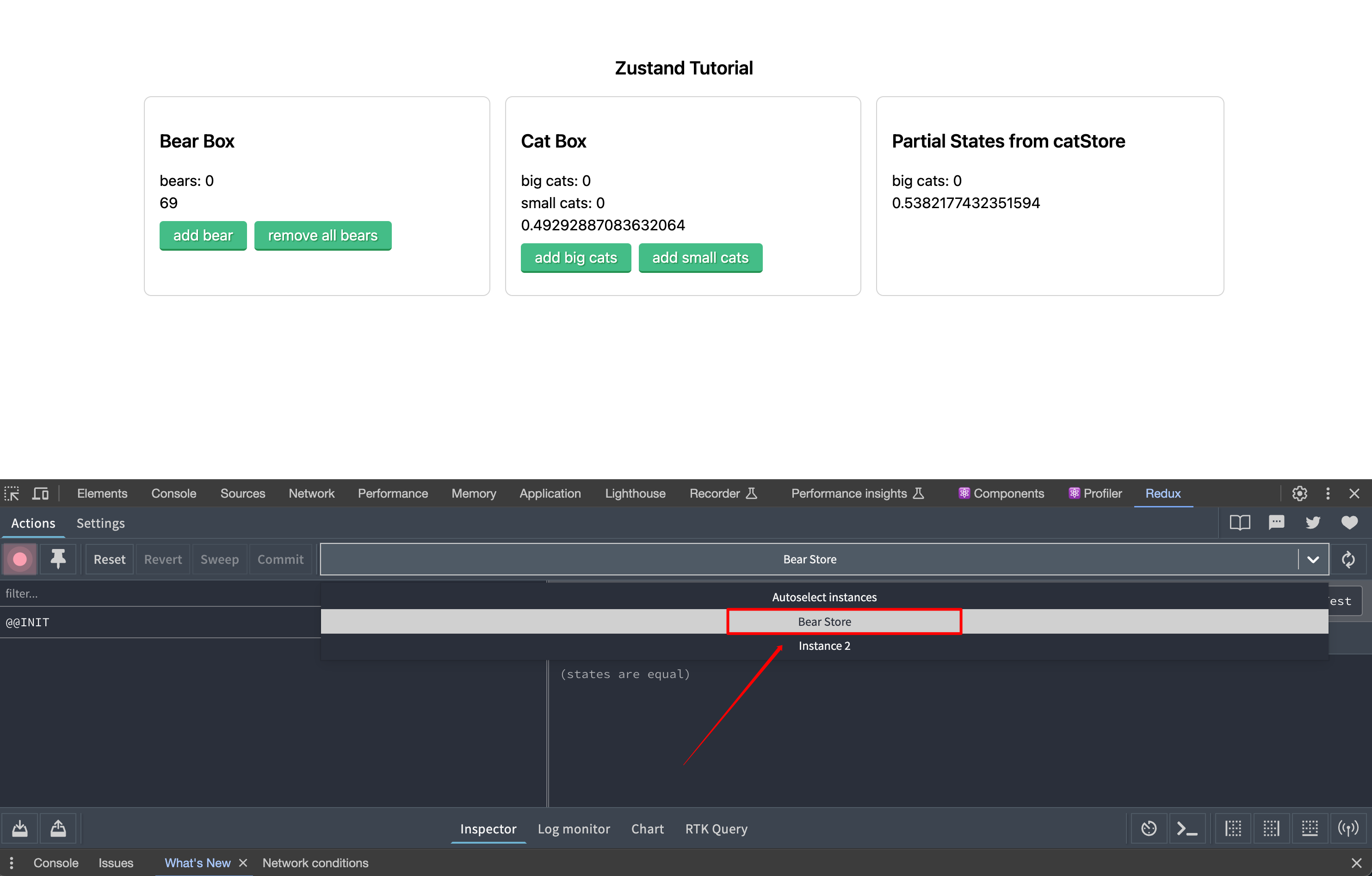 在上面使用 store 的示例中,我们可以看到,我们每次取出 store 中的数据都需要使用 const xx = useBearStore((state) => state.xx) 方式,如果你需要使用很多状态,每一个都这么写会很累,你可能会想,有没有什么方式更简便一点呢?