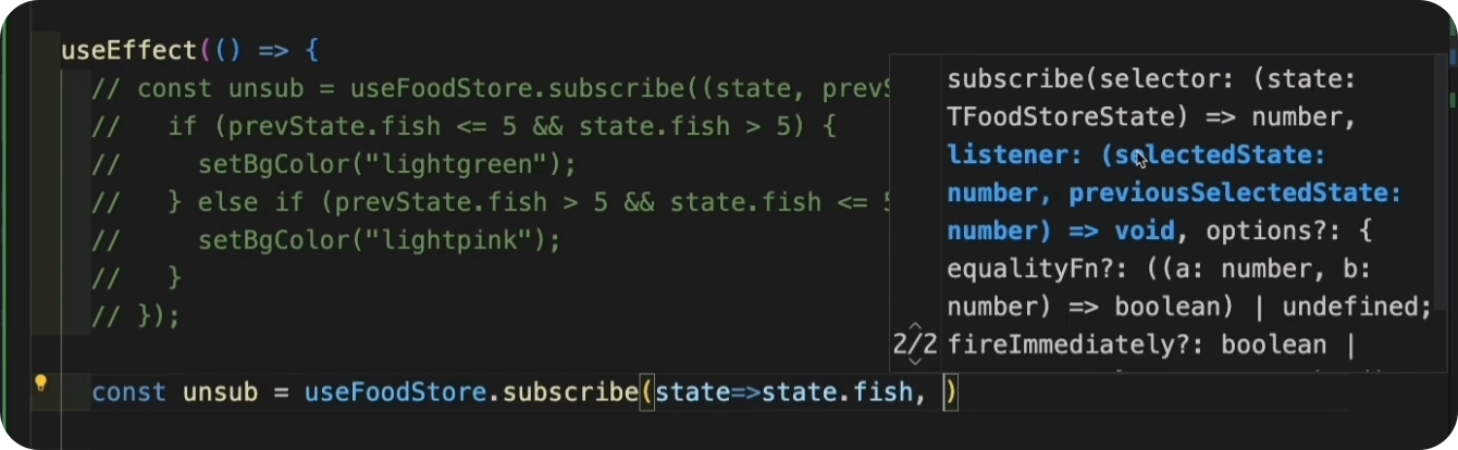 subscribeWithSelector 中间件后,store 中的 subscribe 方法和之前就不同的,这个 subscribe 会返回三个参数,selector、listener、还有一个 options 配置对象。注意 listener 回调函数可以获取的参数也不同,拿到的是你选择的 selectedState -> selector (state.fish) ,还有 previousState (上一次的 state.fish)。