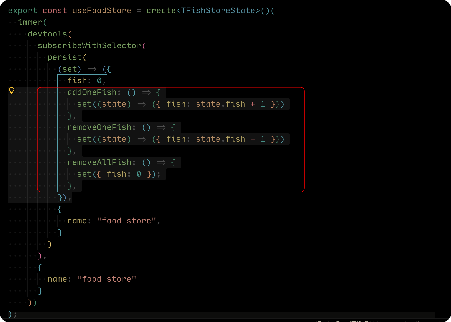 );是不是有点回调地狱的感觉了,一层又包含一层, state 和 Action 都在一起,而且在页面使用的时候,我们还得写各种 const xx = useFoodStore(selector) 如果开发中都这么写,我想你和我一样肯定会骂人,甚至不会考虑这个状态管理库。先别急,我们试着把代码重写一下: