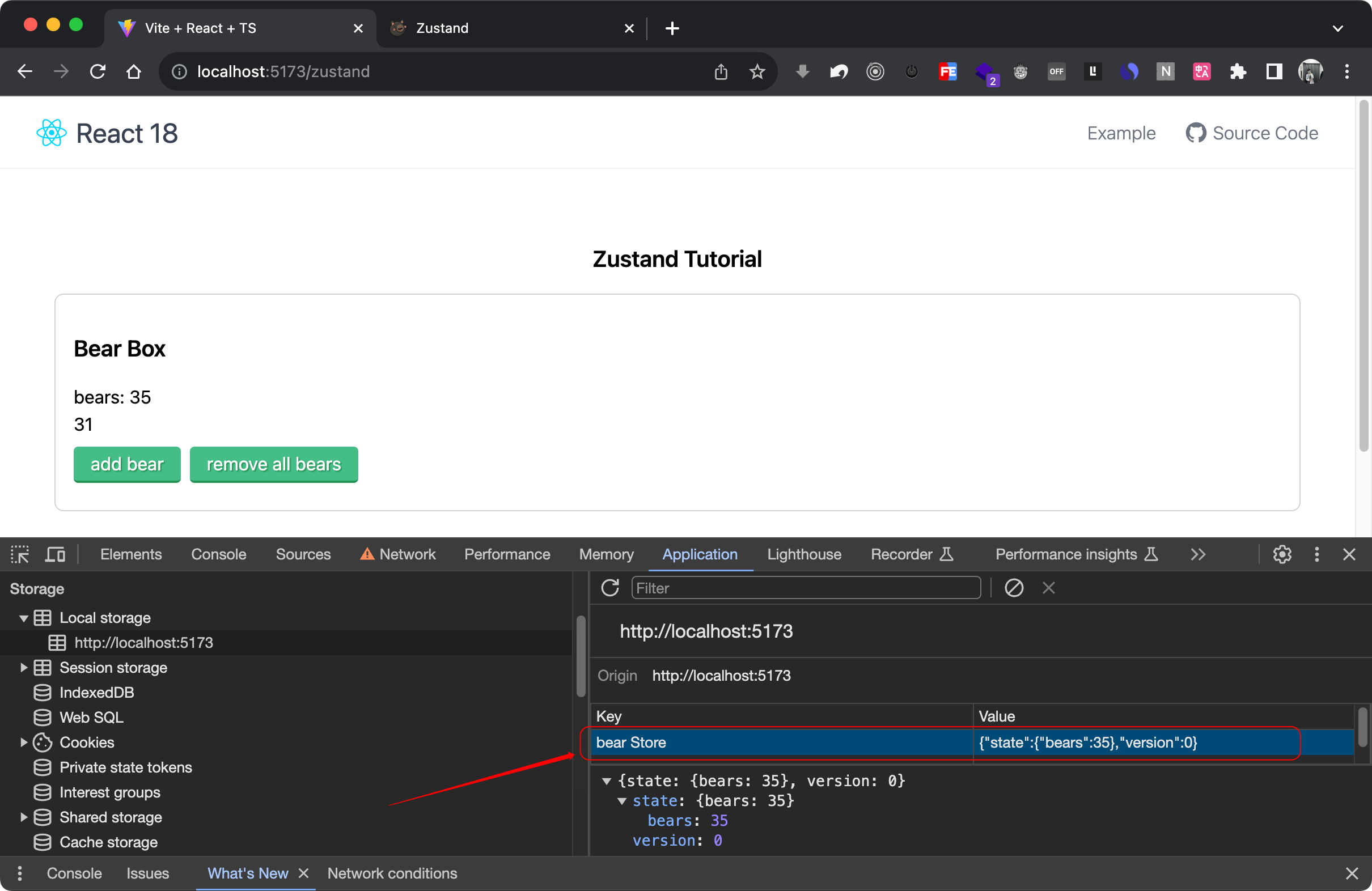 };上面的 useBearStore,返回一个 clalback (回调函数),在这个回调函数里,可以获取到 state,这个state 就是 store 里所有的状态,然后你可以用它返回任何你在 useBearStore 中定义的 state 和 Action。