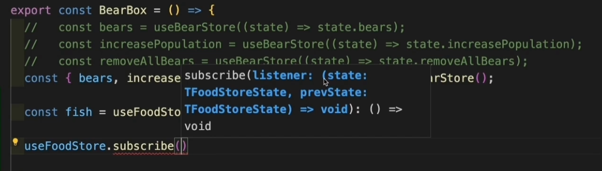 const fish = useFoodStore((state) => state.fish);上面两种消费 store 的方式,那就是 reactive 的。( reactive 的状态会在每次状态变化后都重渲染,而 subscribe 只会在开启订阅的状态发生变化时重渲染 )。
