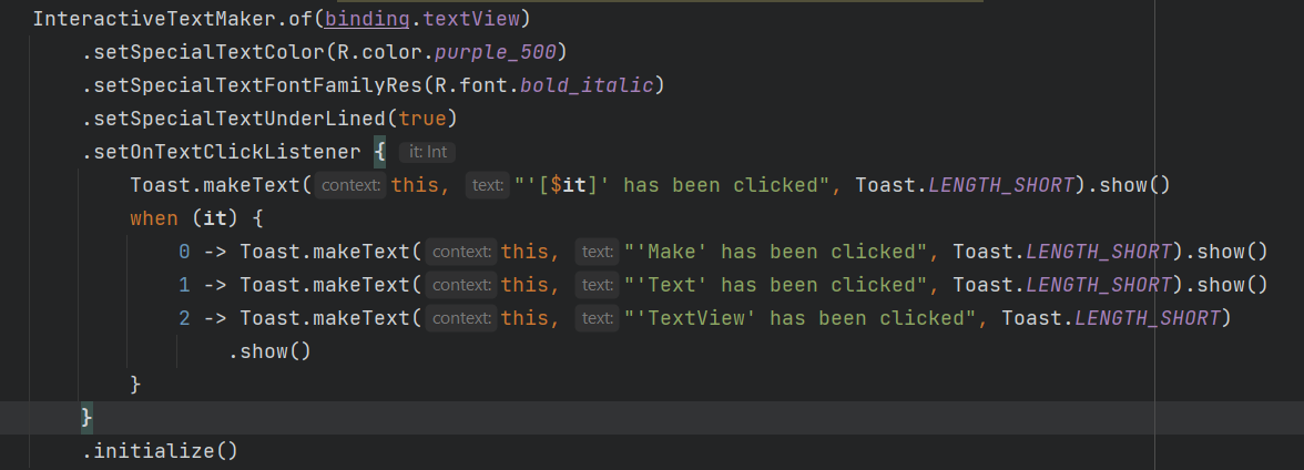 I downloaded your project and ran it. but it doesn't work. please check again  with addOnSpecialWordClickListener it's perfect, it works fine. i also think you should add getValue option, instead of just getIndex