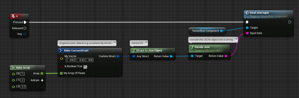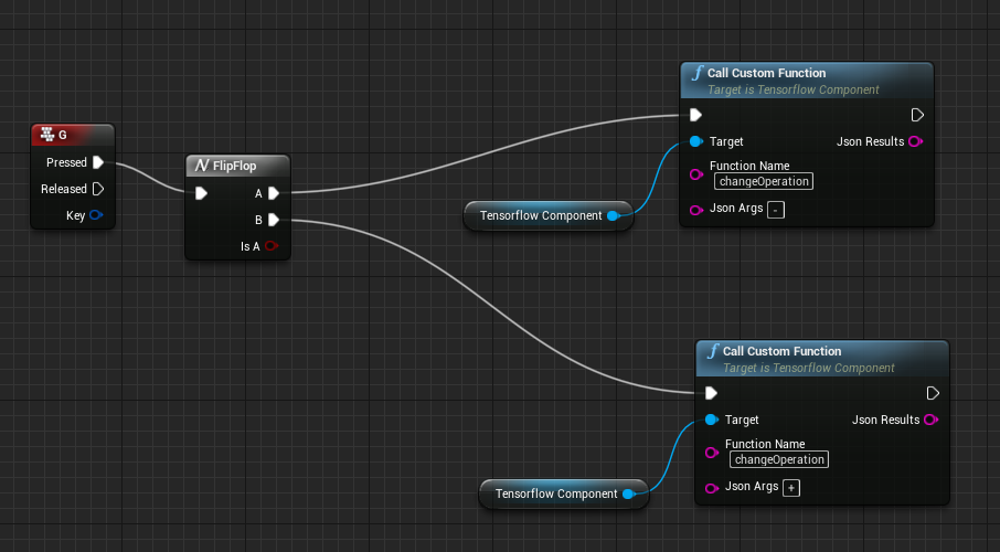 method on the TensorflowComponent. You specify the function name and pass in a string as arguments. The function runs on the game thread and will return immediately with an expected string value. For both arguments and returning values, JSON encoding is recommended, but optional.