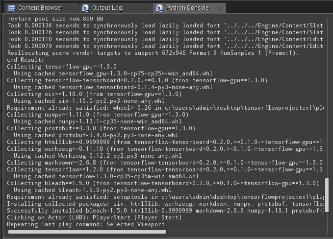 - Wait for tensorflow dependencies to be automatically installed. It will auto-resolve any dependencies listed in Content/Scripts/upymodule.json using pip. Note that this step may take a few minutes and depends on your internet connection speed and you will see nothing in the output log window until it has fully completed.