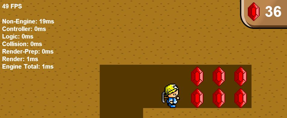 The FPS Counter is an entity that can be added to a layer to display diagnostic information about the game. It will display the average FPS of the game as well as other defined values. To add values trigger a 'time-elapsed' message on the scene layer and the FPS Counter will tally and display the values. The name and time elapsed will be displayed on screen in the format "name: timeElapsed". For more information on setting this up, check out Logic-FPS-Counter.