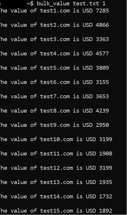 bulk_value ./domains.txt 0.5 # You can extend or, reduce the sleep value (2nd argument) between 0.1 to 1 or, more depending on API throttlingWith larger lists, bulk_value results may become unreliable.